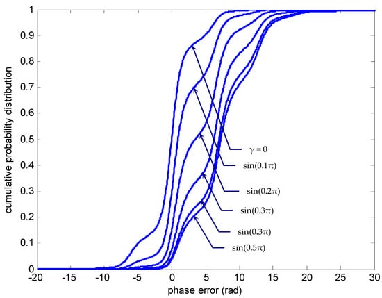 Nonmodulo-2π phase-error cumulative probability distribution at for various detuning factors γ when SNR .