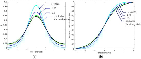 In the following discussion, the modulo-2π PDF, (denoted by a capital letter P) as well as the cumulative probability distribution, and the cycle slipping density function of the phase error for the first-order PLL are presented. The time-evolution of modulo-2π phase-error PDF and cumulative probability distribution is shown in Figure 17. In this illustrative example, the SNR and detuning factor were utilized. The numbers beside individual curves indicate the normalized times, switching τ from 0.625 to 5. The steady state was reached when the normalized time . Since the total time steps for simulation were set as 1000, the grid spacing in the time marching direction was , which is dependent on the normalized time τ. As time τ progressed, the peak value of at zero phase error () was decreasing, while remaining symmetric with respect to the phase-error axis.