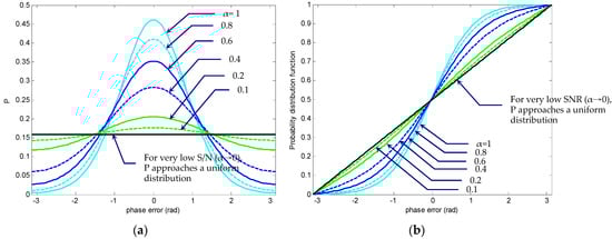 Nonmodulo-2π phase-error (a) density function and (b) PDF , at for various SNR values ().