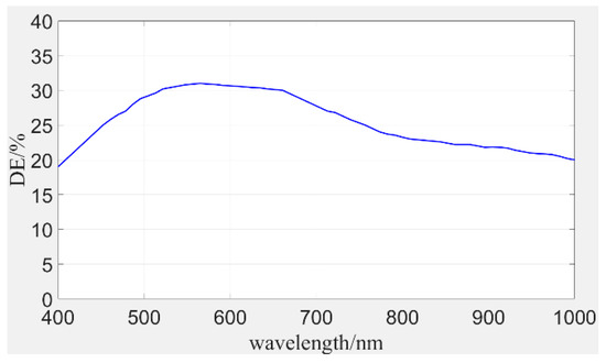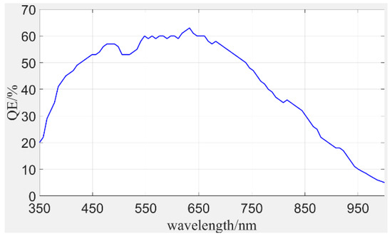 The diffraction efficiency (DE) of the grating is shown in Figure 2, which is the measured data from grating manufacturers. The quantum efficiency (QE) of the sensor is shown in Figure 3.