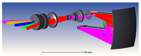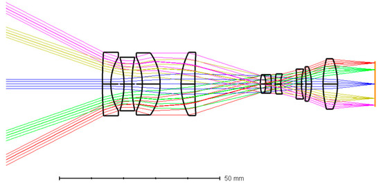 The front objective lens is a wide-angle, broad-spectrum optical system. A telecentric optical system should be used to achieve pupil matching with an Offner spectrometer [20]. The optional objective lenses include double Gauss objective, inverted telephoto objective, and fisheye lenses. The double Gauss objective lens is a large-aperture, wide FOV optical system, but it is difficult to achieve image telecentricity with it. Fisheye lenses can achieve very large FOVs, but the distortion is difficult to eliminate. The inverted telephoto objective lens has a certain ability to eliminate distortion. By complicating the front group of the inverted telephoto objective lens, the FOV can be enlarged, and the image telecentricity can be formed by using a field lens in front of the focus. Finally, an inverted telephoto is adopted with good corrections for aberrations, especially chromatic aberrations. The final design result of the front objective lens is shown in Figure 5, which consists of 10 spherical lenses. The total length and back focal length are 85 and 11.7 mm, respectively. Figure 6 shows the modulation transfer function (MTF) of the optimized front objective lens at 77 LP/mm, and the MTFs of all bands are greater than 0.32.