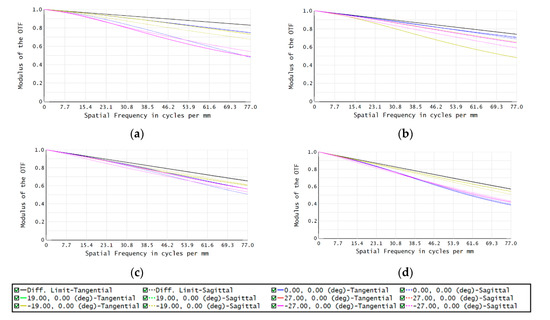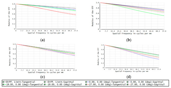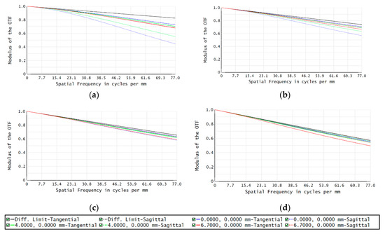 MTF of the integrated system (a) 400 nm; (b) 600 nm; (c) 800 nm; (d) 1000 nm.