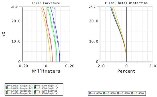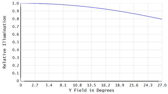 The field curvature and distortion of the system are shown in Figure 7, and the maximum relative distortion is less than 1.2%. The relative illumination is shown in Figure 8, and we can see that the illumination of the edge FOV is about 70% of the center FOV.
