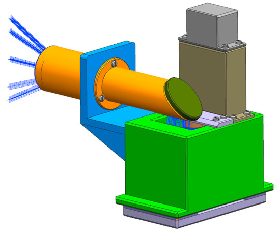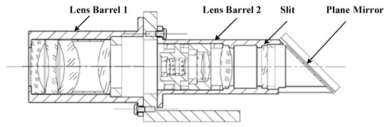 The objective lens consists of 10 lenses, a plane mirror, and a slit. When designing the optical–mechanical structure, all components are installed in two lens barrels, as shown in Figure 13. Lens barrel 1 contains four lenses, lens barrel 2 contains six lenses, and the distance between the lenses is guaranteed by spacers.