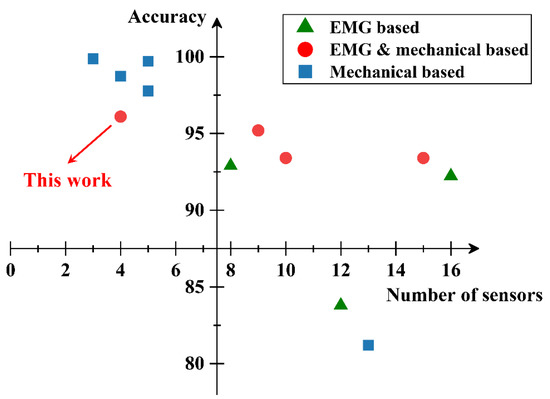 To obtain multi-dimensional information, the fusion of multi-sensor data, together with machine learning-based sensor fusion algorithms, is widely used in terrain identification in recent years. Some studies report the integrated use of accelerometers, angle sensors, kinematic data captured by camera, EMG signals, etc., to differentiate terrains [20,21,29,30,31]. For example, in [32], nine EMG and six ground reaction force (GRF) sensors were utilized, based on which five terrains were identified continuously in four gait phases using the linear discriminant analysis (LDA) and support vector machine (SVM) methods, and the ramp–level ground classification accuracy in this work was averaged at 97.73%. In [20], four healthy subjects performed walking activities on uphill, level ground and downhill, and a high average terrain classification accuracy of 93.4%, based on the Bayesian LDA, was achieved through developing a technique consisting of an interaction force sensor, four EMG sensors, four GRF sensors, and a position sensor. In [21], the data from seven healthy subjects collected by seven EMG sensors and two accelerometers were obtained and used to classify the terrain transition from level ground to stairs or ramp; from this, the classification performance of the EMG and accelerometer signal was compared and discussed, proving that the fusion of both signals may contribute to a more robust classification. In [19], a terrain identification-enabled exoskeleton system which integrated only two attitude and heading reference system (AHRS) sensors and three GRF sensors was designed, tested by three healthy subjects and successfully identified ramp and level ground, with a mean accuracy of 97.77%. The number and categories of the applied sensors and the classification accuracy of the above studies, along with some other relevant studies [17,33,34,35], are summarized in Figure 1.
