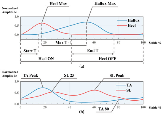 - Muscle force features extracted from the EMG and LE, including the TA peak, TA 80, SL peak, SL 25. Such features reflect the muscle force level at a particular timing of a stride and they are depicted in Figure 4b.