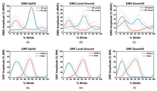 The ensemble average of the EMG and GRF signals with ±1 SD band in three terrains: (a–c) are the tibialis anterior (TA) and soleus (SL) EMG profiles of uphill, level ground and downhill, normalized by the 50% of maximal isometric voluntary contraction (MIVC), respectively. (d–f) are the GRF profiles of uphill, level ground and downhill, normalized to the body weight (BW).