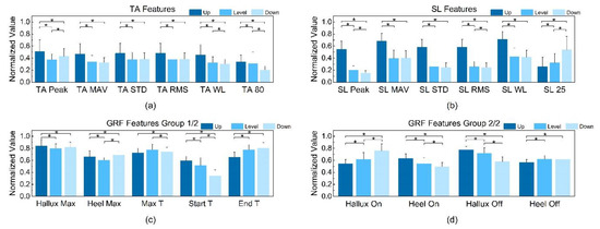 The statistical features of the EMG and GRF in the different terrains: (a) TA EMG features. (b) SL EMG features. (c) Group 1 of GRF features. (d) Group 2 of GRF features. (* p < 0.05).