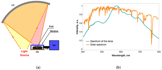 Scheme of the experimental setup (a) and the normalized emission spectrum of the lamp vs. the standard solar spectrum ASTM G173-03 (b). (a) presents a chamber (Ch) with a fuel, a gas analyzer (GA), and a light concentrating mirror (LC).