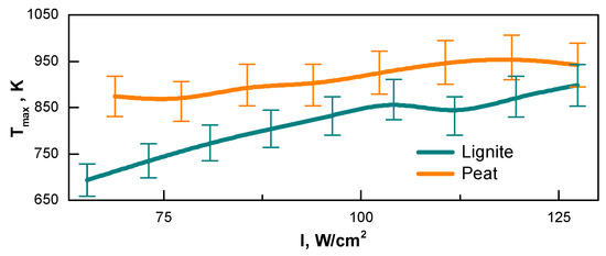The TIS was directed at the irradiated fuel surface keeping a small angle to the surface normal vector through the hole on the top side of the chamber (the glass was removed from the window). The operating wavelength range of the TIS was in the LWIR region; thus, the lamp light did not have a considerable influence on the results. The surface temperature was measured for 30 s at different light flow intensities. The saturation of temperature dependence occurred after 5–10 s, and these steady-state values fully characterized the heating regime during the fuel conversion. The dependence of the steady-state temperature on the intensity of light flow is shown in Figure 2. The water content of peat and lignite here was 25 wt.% and 35 wt.%, respectively.