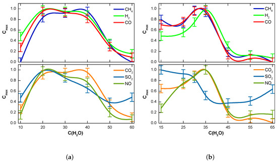 Figure 3b shows the curves of gasification results vs. lignite moisture. An increase in the water concentration from 15 wt.% to 35 wt.% intensified the production of most gases (excluding SO2). However, the production of carbon oxides did not grow so sharply as in the case of the peat-based mixture. A further increase in the water content by 10 wt.% lead to a substantial decrease in the production of all gases. The fuel composition with such a big amount of water could not be gasified using the proposed method within a reasonable time because of the long duration of drying of extra water. The fuel moisture range from 35 to 45 wt.% was interesting in terms of experimenting with the ratio of the main combustible and non-combustible conversion products.