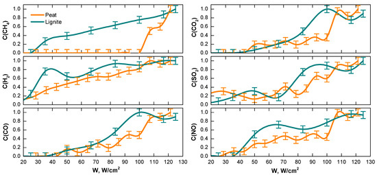 As was shown above, the intensity of the light flow that pumped heat into the reaction volume determined the temperature of the fuel surface. This had a considerable effect on the heat dissipation inside the fuel layer, which was also conditioned by the fuel properties. Using the findings from the previous section, the fuel moisture content could be determined that provided the highest ratio of CO and CO2 concentrations, that is the fuel composition with the highest calorific value of syngas. These fuels were peat with a moisture content of about 25 wt.% and lignite with a water content of about 30 wt.%. The gasification of such compositions using different light flow intensities had some specific aspects. Figure 4 shows the maximum concentrations of different syngas components vs. the incoming light intensity. The concentration values were normalized according to the procedure described above, using the normalization factors presented in Table 3.
