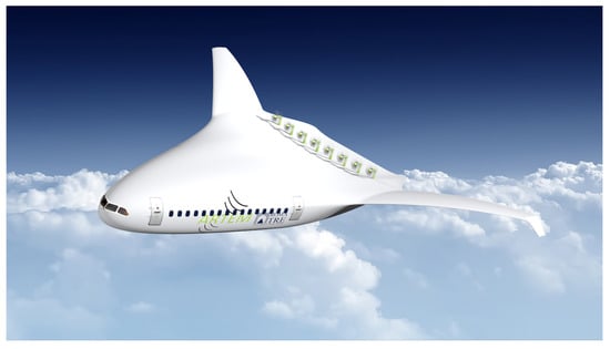 In the last few decades, the efficiency of air transportation has become a primary aspect for aeronautical designers, due to the constant growth of the aviation industry throughout the last century and its expected further increase in the near future []. In turn, the CO emissions due to the aviation industry are foreseen to grow in the next future—a 75% increment was recorded between 1990 and 2012 and it is projected to grow 300% by 2050 []. At this purpose, the international institutions have set quantitative goals for limiting chemical pollution and perceived noise to be fulfilled by the future aviation. Specifically, with respect to the average emissions at 2000, a 75% reduction in , a 90% reduction in and a 65% one in perceived noise of flying aircraft have been settled for 2050 []. As a consequence, two concurring facts are biasing the long-term development of commercial aircraft: the increasing operational constraints to mitigate the environmental impact, and the saturation of the potential development of standard technologies and concepts. These factors impose the identification of breakthrough concepts and highly-innovative technologies to guarantee the air transportation system sustainable development. Most of the solutions currently under analysis present unconventional characteristics in both the aircraft layout and its propulsion system [,,]. It is worth noting that, besides environmental issues, financial interests also drive the aviation industry towards unconventional airframe layouts and novel propulsion systems. As a matter of fact, the typical fluctuation of fuel price make the amount of fuel burnt per flight an uncertain parameter, since in the early design phases.