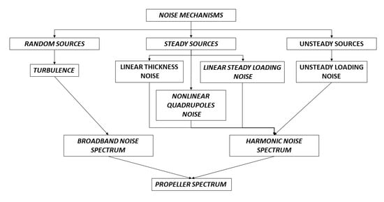 As depicted in Figure 2, the noise mechanisms that contribute to propeller noise spectrum can be classified in three main groups: steady sources, unsteady sources, and random sources.