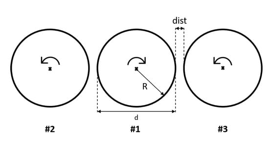 The hub distance between two adjacent propellers in the array is defined as the sum of the rotor diameter, d, and the tip-clearance, , as shown in Figure 3. For every analysed configuration, the rotor (#1) spins counterclockwise (if viewed from the front), whereas the other rotors (#2 for the twin-propeller array and #2 and #3 for the three-propeller one) rotate clockwise. In order to perform a sensitivity analysis on the effect of the tip-clearance (and hence of the aerodynamic interaction effects) on the emitted noise, for the twin-propeller configuration four analyses with increasingly tip-clearance distance from m to , with = {0, 0.125d, 0.25d, 0.5d}, are performed, whereas the three-rotor array is analysed only for the tip-clearance . Note that, the additional distance of m is introduced to avoid tips impingement due to the rectangular shape of the blades. All the analysed configurations are in axisymmetric flight condition, with an advance speed of 164 m/s, a blade rotational velocity 2500 rpm, and provide a thrust of 3700 N.