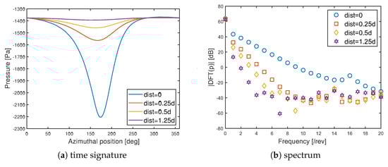Then, Figure 5a shows the time history over an entire revolution of the perturbation pressure () on each blade of rotor #1 (at the quarter–chord of the blade section located at the radial station ) for = {0, 0.25d, 0.5d, 1.25d}. As expected, as the distance between the rotors diminishes, a growing (in absolute value) pressure peak appears, having its minimum located approximately at the azimuth position where the blade is closer to the second rotor. The aerodynamic interaction becomes negligible for the tip-clearance of the order of magnitude of the rotor diameter. Figure 5b depicts the spectrum of the pressure signals in terms of Discrete Fourier Transform (DFT) module, showing that, for all the configurations considered, the pressure signals are strictly tonal (due to the aerodynamic formulation hypotheses the analysis is based upon), with frequencies multiple of rotor angular velocity, . Moreover, the spectrum of the minimum-distance configuration presents a linear behaviour up to −20 dB, with a very weak, secondary peak at , whereas the linear part of the spectrum for larger distances extends up to about −40 dB, followed by an irregular behaviour at the higher frequencies, probably due to numerical errors (given the low values of harmonics amplitude). As expected, when the distance between rotors increases, the pressure signal tends to become uniform during the rotor revolution, as in the case of an isolated propeller (indeed, the spectrum harmonic content tends to vanish).
