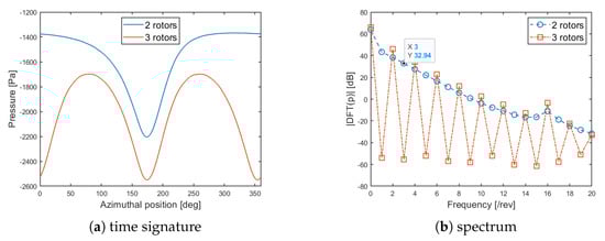 Finally, for the minimum-distance configuration, Figure 6a shows the comparison of the time history of the pressure at the quarter–chord of the blade section at of the rotor #1 for the twin- and three-propeller configurations. As expected, in the three-propeller configuration two peaks with the same intensity appear, at the azimuth positions at which the blade of rotor #1 is closest to those of the rotors #2 and #3. Furthermore, Figure 6b compares the spectrum of the pressure signals. Also in this case the spectrum of the three-propeller configuration is linear, with harmonic content at the only frequencies multiple of (no odd harmonics are present). Finally, the even tones of the three-propeller configuration are globally more intense than those of twin-propeller case.