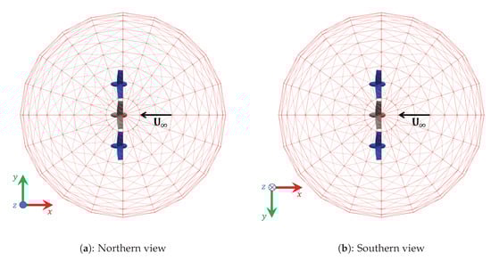 This section presents the acoustic predictions for the twin- and three-propeller configurations and those for the isolated propeller, as well as the sensitivity analysis of the emitted noise of the multi-propeller configurations to the rotors tip-clearance. All the numerical results concern the noise emitted by rotor #1 and are evaluated over a sphere of radius equals to 5 m, centred at the hub of the rotor #1 (depicted in grey in Figure 7). In practical applications, the acoustic characterisation of single elements of an array allows scattering and propagation analysis considering multiple equivalent sources. The underlying assumption is that the equivalent sources may be considered equal, except for those of the first and last element of the array. Thus, obtaining results for each propeller of a three-propeller configuration, allows the evaluation of the noise emitted by an array of arbitrary number of propellers. For all cases shown in the next section, the results have been presented from two views: the northern view (where the sphere is observed from above) depicted in Figure 7a, and the southern view (where the sphere is observed from below) depicted in Figure 7b. For the sake of clearness, in both pictures the flow direction is shown in black (-x direction).