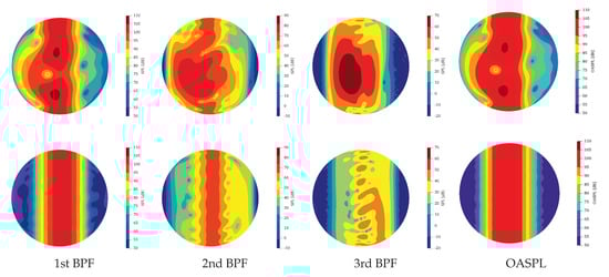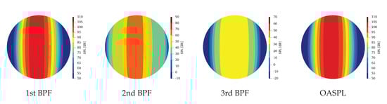 Furthermore, the three-propeller configuration, with tip-clearance equal to 0, is analysed. Figure 12 shows the directivity pattern on the 5-m sphere, in terms of SPL of the first three BPFs as well as in terms of OASPL, for the southern (first row) and northern (second row) hemispheres.
