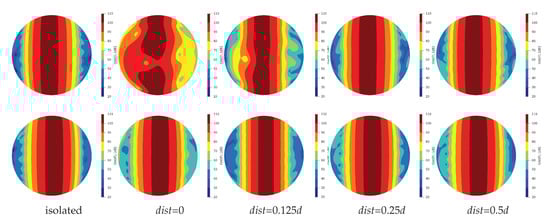 As expected, the northern hemisphere (second row) remains unaffected by the relative distance between rotors, whereas the southern (first row) hemisphere is significantly modified for . Note that, this threshold might seem to contradict the aerodynamic results shown in Figure 5a, where the effects of rotor proximity are already evident for . This is because the thickness contribution dominates the emitted noise, hiding the loading term, which is the only contribution affected by aerodynamic interaction effects. This concealment effect is also exacerbated because noise is expressed in dB.