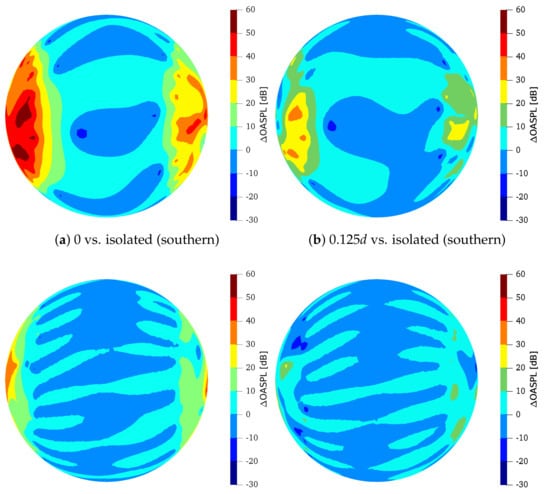 Finally, Figure 11 shows the variation of noise emitted by rotor #1 with respect to the isolated rotor in terms of dB, for the two configurations whose noise is more affected by the interaction phenomena ( and ). The main effect is the change in the noise directivity in the forward direction on the southern hemisphere, which increases with the tip-clearance reduction (note that the logarithmic scale hides the variations in the high noise region). The noise level is globally increased, although some regions (located near the south pole) may present lower OASPL values.