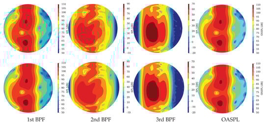 These considerations can be extended to the OASPL, which is dominated by the pattern of the 1st BPF (in this case, the maximum noise level on the southern hemisphere is about 2 dB higher than that of the northern). On the contrary, the higher harmonics hemispheres significantly differ with respect to those relative to the isolated rotor, with associated maximum noise levels 10 to 20 dB higher.