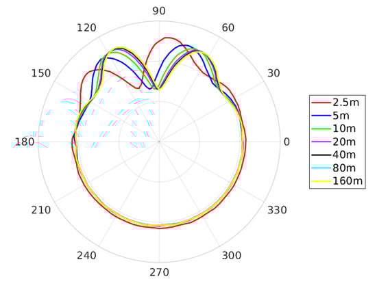 Finally, Figure 13 shows, for the twin-propeller configuration with tip-clearance equals to and for microphones located on circles in the propeller rotational plane with increasing radius, the comparison between the pressure field directivity pattern at the normalised with the ratio between the reference circle radius (5 m) and the current one. This analysis is aimed at defining the far-field boundary, that is, the distance from the hub centre beyond which the pressure decreases as the inverse of the distance.