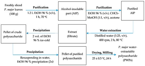 As described in Figure 1, the extraction of PWPs was performed with some modifications according to an adapted method described in literature [,,]. Briefly, fresh sliced leaves of P. major were treated with 96% ethanol (1:12, w/v) for 1 h at 70 °C and then filtered. The alcohol-insoluble part was washed successively with 96% ethanol, chloroform-methanol solution (1:1, v/v) and acetone []. The residue was extracted with distilled water (1:25, v/v) at 80 °C for 2 h with continuous stirring. The obtained extract was filtered and precipitated by adding two volumes of 96% ice-cold ethanol. The precipitate was recovered by centrifugation (5000 rpm, 15 min, 4 °C), resuspended in distilled water (200 mL) and precipitated again with two volumes of 96% ethanol. The last steps were repeated two times. The final precipitate was washed twice with acetone and then dried one night at room temperature.