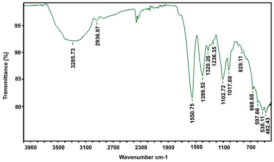 FTIR spectrum of PWPs is shown in Figure 2. The analysis indicated a broad absorption peak at 3285 cm−1 corresponding to the hydroxyl (O-H) stretching vibration of polysaccharide as well as water absorption []. The displayed weak absorption band at 2936 cm−1 suggested the asymmetric vibration of (C-H) group []. The strong characteristic absorption peak at 1550 cm−1 was attributed to the vibration of COO− group of the galacturonic acid and those at 1399 cm−1 could correspond to ester carbonyl groups of the carboxylic function of GalA []. The signal obtained at 1017 cm−1 resulted from the presence of carbohydrate (C-O) functions []. Consequently, the results from FTIR assumed a rich polygalacturonic acid pectin type structure of PWPs.