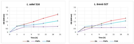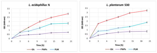 Optical density value (OD) of L. acidophilus N, L. plantarum S30, L. sakei S16 and L. brevis S27 strains in the presence of glucose (Glc), PWPs and PLM. All analyses were conducted in triplicate, and data are expressed as mean values ± SD. Three-way ANOVA test: Sig. (p < 0.05), partial eta2 (0.822–0.998), R2 = 0.997 (R2Adj. = 0.996).