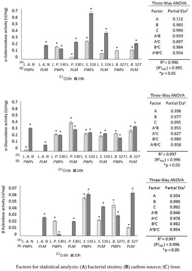A three-way ANOVA test was performed three times in order to evaluate the statistical significance of the individual factors–carbon source (glucose, PWPs and PLM), bacterial strains (L. A. N, L. P. S30, L. S. S16 and L. B. S27) and time (6 h and 20 h) on the dependant variables (the enzyme activities: α-galactosidase, α-glucosidase and β-xylosidase activity). The results (Supplementary Materials: Table S3) showed that there was a statistically significant difference between all of the individual factors and their combination interactions (p < 0.05), with R2 value close to 1 (0.996–0.997), indicating a considerable linear relationship between the factors and the dependant variable. Tukey’s HSD tests for post-hoc analysis were also carried out in each of the three different ANOVA tests. The results showed that in the different time points (0 h, 6 h, 20 h) all the mean differences of the dependent variables were significant, except for 6 h and 20 h of the α-glucosidase activity and the values for all time points of β-xylosidase activity.