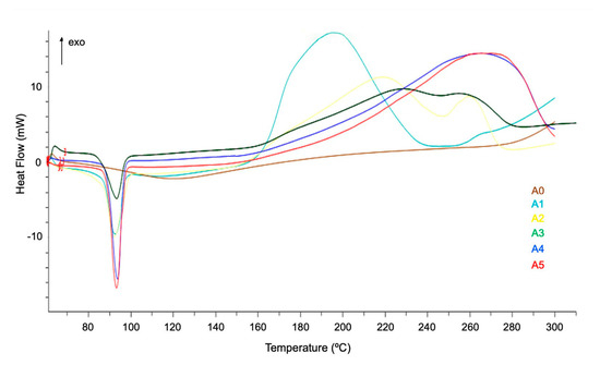 Figure 1. DSC thermograms of insulin-loaded PEG/mucin matrixes in superposition. Batch description: A0 = mucin/PEG/insulin (1:1:0), A1 = mucin/PEG/insulin (1:1:15), A2 = mucin/PEG/insulin (1:2:15), A3 = mucin/PEG/insulin (1:3:15), A4 = mucin/PEG/insulin (1:4:15), A5 = mucin/PEG/insulin (1:5:15). Note: mucin and PEG are measured in grams, while insulin is measured in milliliters.