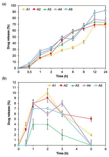 Figure 3. Insulin release profiles at pH 7.4 (a) and at pH 1.2 (b). Formulations A1–A5: A1 = mucin/PEG/insulin (1:1:15), A2 = mucin/PEG/insulin (1:2:15), A3 = mucin/PEG/insulin (1:3:15), A4 = mucin/PEG/insulin (1:4:15), A5 = mucin/PEG/insulin (1:5:15). Data represent mean values ± SD (n = 3; p < 0.05). Note: mucin and PEG are measured in grams, while insulin is measured in milliliters.
