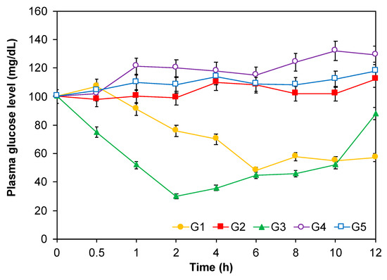 Figure 4. Percentage decrease of the blood glucose level in rats treated with insulin-loaded MP formulations (n = 5). Groups G1–G5: G1 = received insulin-loaded MPs (formulation A5), G2 = received pure insulin solution, G3 = received subcutaneous insulin, G4 = received water, G5 = received unloaded MPs (batch A0). Data represent mean values ± SD (n = 3).