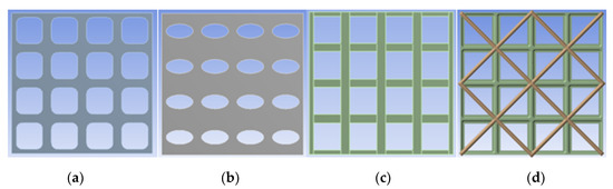 Figure 2. Shape definition: four geometries were considered: (a) rounded rectangles and (b) ellipses holes, or (c) rectangular and (d) triangles in quadridirectional grids.- -
