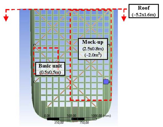 - Decoupling the effects related to the geometric characteristics of the basic shapes (i.e., rectangle, triangle, etc.) from those related to their recurrence and rearrangement. It was obtained repeating the optimization procedure acting on different levels. Specifically, in Figure 3 these different scales of analysis are displayed, showing the basic unit (500 × 500 m), used for geometrical optimization of shapes (Figure 2), and the mock-up (2500 × 800 mm), used for grid optimization, experiments and model validation. It should be noted that the figure shows half (front) section of the vehicle roof (with ~5200 × 1.600 mm as overall dimension);