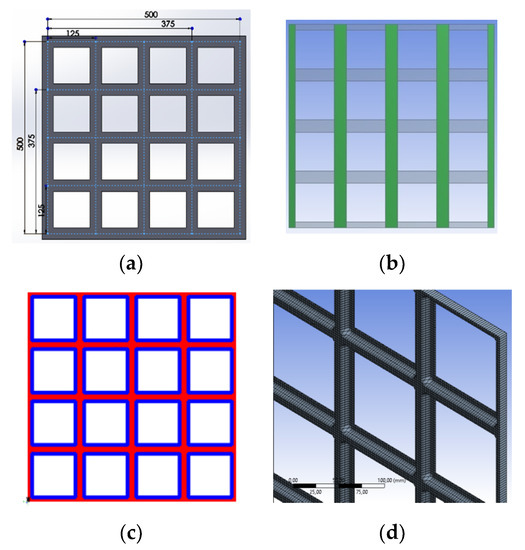 Details in sandwich discretization (in the case of rectangular grid): (a) the 500 × 500 mm base section; (b) vertical beams over respect to the horizontal ones; (c) sides where the thickness of the sandwich must decrease; (d) final mesh (also showing the thickness changes).