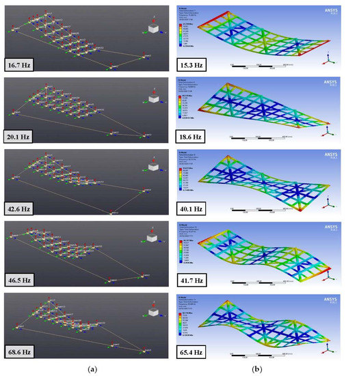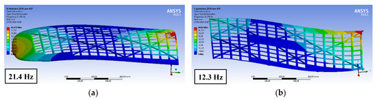 The first simulation was a modal analysis and concerned the resonance frequency. It was carried out in free-free conditions: no constraints or forcing were set. The first six modes are rigid modes, corresponding to the structure’s six degrees of freedom. Therefore, the seventh mode and frequency correspond to the first modal shape of interest (Figure 5a).