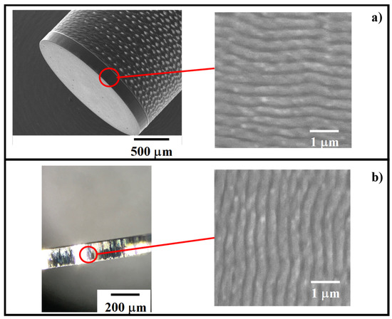 When using this femtosecond laser irradiation, a nanotexture was formed on the irradiated surface by LIPSS (Laser Induced Periodic Surface Structuring) [12]. Since this first discovery on LIPSS, many studies have reported its theoretical and experimental factors, as well as its application to the modification of surfaces and optical properties and its tribological performance [13]. This nanotexturing has the possibility to work simultaneously with the laser trimming of diamond-coated punches. As illustrated in Figure 1a, directionally nanotextured ripples are superposed on the trimmed diamond coatings by the simultaneous optical interference between the incident light and the scattered beams due to the trimmed surface roughness. As illustrated in Figure 1b, when using this laser-trimmed punch with its nanotextured side surface for the piercing process, these nanotextures are possibly transcribed onto the pierced hole surface of the metallic sheet concurrently with the piercing process. This concurrent transcription of nanotextures on the pierced hole is a result without any precedent in the literature.