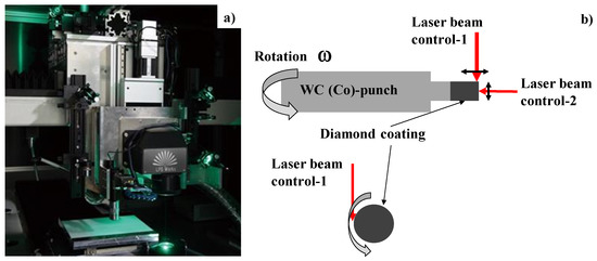 Among these treatments, the laser trimming process is effective not only to reduce surface roughness but also to adjust the punch surface configuration. The excimer laser treatment was first utilized for the trimming of a diamond-coated WC (Co) punch [9]. The diamond-coated punch head geometry was adjusted accurately within tolerance ranges from +0.1 to +0.6 μm without a significant change in the Raman spectrum of diamond coating by trimming. The femtosecond laser trimming method also improved the dimensional accuracy of the fine piercing punches [10,11]. The edge curvature radius of the diamond coated WC (Co) punch was reduced from 12.5 μm down to 2.5 μm. AISI316L stainless steel sheets were successfully pierced by this trimmed punch to narrow the affected zone in the cross-section of the pierced sheets.