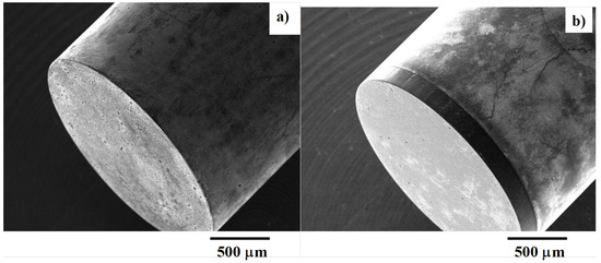 Comparison of CVD (Chemical Vapor Deposition)-diamond coated WC (Co) punches before and after femtosecond laser trimming: (a) before trimming and (b) after trimming.
