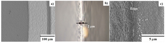 Figure 5 shows SEM and LM images of the diamond coated WC (Co) punch after trimming. As depicted in Figure 5a, the laser-machined traces are seen in the circumferential direction. The incident laser has the possibility to engage in optical interactions with the scattered beam via the rough diamond coating surfaces and to form nanostructured ripples through this interaction. Figure 5b proves that the original rough edge with a radius of curvature of 12.5 μm was reduced down to an edge width less than 2 μm via this laser trimming. Figure 5c also demonstrates that nanotextures with an LIPSS-period of 300 nm were formed in the axial direction from the vicinity of the punch edge in this laser trimming process by using second harmonics with a fluence of 0.6 J/cm2. The agreement between this measured nanotexture width of 300 nm and the theoretical estimate of 250 nm assures that the measured nanotextures in Figure 5c are simultaneously induced by the present femtosecond laser trimming process.