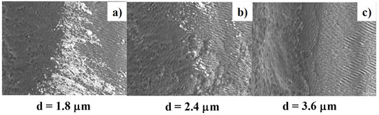 Let us consider the directivity of the unidirectional nanotextures in Figure 5c. As discussed in [13,16,17], the nanotextured ripples in the lateral direction are induced by femtosecond laser scanning in the longitudinal direction on a relatively smooth surface with a low roughness. In the present trimming process of the diamond coating on the cylindrical punch, the scattering laser was skewed by the local curvature on the trimmed diamond surface so that every nanotextured ripple was formed in the axial direction with a skewed angle. This nanotexturing process involving trimming the cylindrical diamond coating was mainly governed by the local curvature of the cylindrical punch, as well as the original roughness of the diamond coating. On the other hand, the laser trimming conditions, such as the trimmed depth of the cut (d), have less of an influence on this nanotexturing. In order to demonstrate the insensitivity of the trimmed depth to the induced nanotexturing process, three diamond punches were prepared and trimmed by d = 1.8, 2.4, and 3.6 μm.