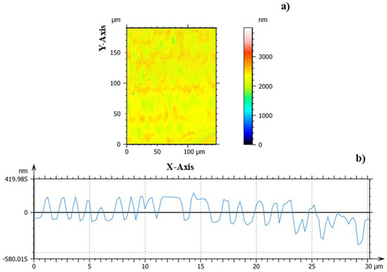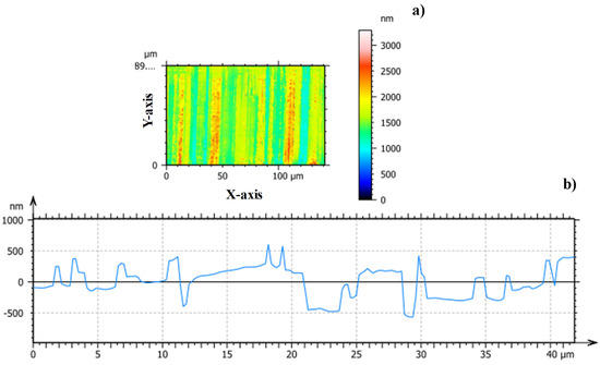 WLI is utilized as a nondestructive evaluation method for the diagnosis of nanotextures on the profiles of trimmed punch surfaces. This WLI is usually used to measure the geometric angulation of polished and buffed die surfaces with relatively small curvature radii; e.g., the local imperfections on the die surface profile are detected as a Moire pattern, from which the local surface condition is shown to involve geometric angulation with spatial frequencies [18]. The trimmed diamond-coated punch in Figure 5 was employed as a specimen for WLI to measure the spatial period of nanotextured ripples on the trimmed surface. Figure 7a depicts the two-dimensional surface angulation on the trimmed diamond coating. If the trimmed surface were flat like a laser-polished surface, no Moire patterns or no two-dimensional angulations could be seen. If the trimmed diamond coating had randomly distributed roughness, the two-dimensional profile analyzed by WLI would have an irregular convex–concave pattern. The measured two-dimensional profile in Figure 7a has a regular distribution with the spatial period. In particular, regularly modulated nanotextures in the X-axis are aligned in the Y-axis. Figure 7b shows this local surface profile in the X-axis or in the lateral direction of the punch surface, which was analyzed by the DEAP algorithm. Although this profile gradually deviates from the center line, the nanotextures are formed on the trimmed punch surface with a skewed angle in the axial direction. The measured spatial period of the nanotextures (Λpunch) is 900 nm, and their average height reaches 300 nm.