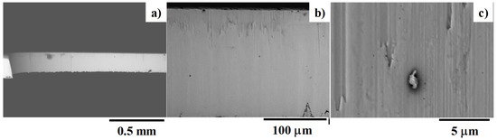 The trimmed diamond-coated punch and the core die were fixed into the cassette die for the piercing experiment. In the present experiment, clearance was controlled to be 4%, which is similar to fine blanking process used for automotive parts. Misalignment of the punch to the core die was avoided by the movable x–y stages of the stamper, making the eccentricity negligible. The pierced holes were observed by optical microscopy and SEM under different magnifications. As depicted in Figure 8a, the entire hole surface was metallic and shiny, without any traces of fractured areas. In fact, the burnished surface area ratio was measured to be 100%, as shown in Figure 8b. An SEM analysis with higher magnification revealed that nanotextures were formed on this burnished surface, as depicted in Figure 8c. Nanotextures with a spatial period of 0.3 μm were superposed on the fine burnished surface profile. That is, hole surface pierced by the present trimmed punch was characterized by its multi-dimensionally modified profile. It was fully burnished similar to the fine-blanked surfaces under narrowed clearance [19]. In addition, this surface burnished by the trimmed punch features a regular nanotextured microscopic profile dissimilar to the fine-blanked surface profile, with significant roughness in the order of 3 to 5 μm at maximum.
