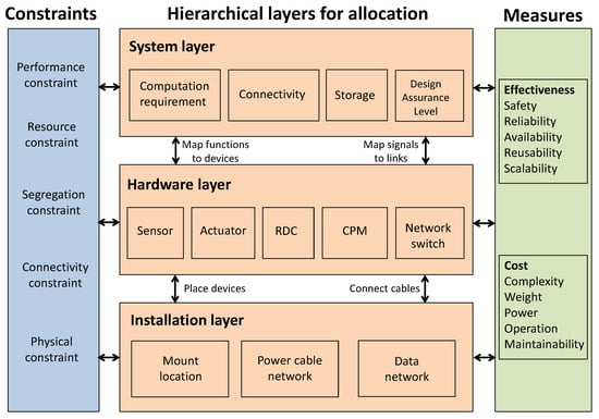Understanding system architecture of DIMA is essential for optimizing the system. Figure 1 illustrates the overall architecture of DIMA system, with the consideration of the hardware and software mapping and its quality measures as well as constraints. It has a hierarchical layer design for allocation, which includes system layer, hardware layer, and installation layer. The subsystems in the system layer are supported by the hardware in the hardware layer, with functions mapped into devices and signals into links. The hardware in the hardware layer is installed into the installation layer, by placing devices into mount locations and connecting cables via networks.