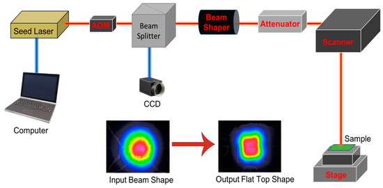 A charge-coupled device (CCD) camera (Thorlab) was used to obtain a live view of the laser writing. The output collimated beam was a nearly symmetric Gaussian with M2 < 1.3 (beam quality factor). A beam shaper (PiShaper, Berlin, Germany) was used to transform the Gaussian shape beam into a flat top shape so that a more uniform energy distribution could be achieved than the original round-shaped beam (Figure 1 inset). All the parameters were controlled by a computer, which signaled the laser to irradiate its beams accordingly. The setup was placed on a 4′ × 6′ optical table.