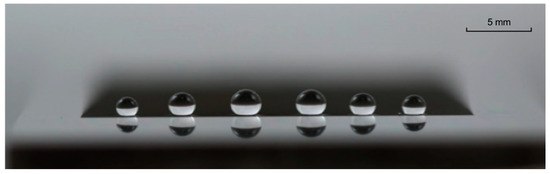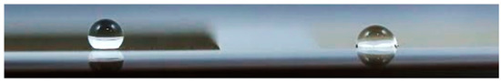 The hydrophobicity of the surface was evaluated by measuring the contact angle and the rolling angle of water droplets deposited on the structured metal surface. The contact angle is defined as the angle of a droplet where the water–air interface intersects the metal surface, characterizing the tendency of a liquid to spread on a solid surface; the rolling angle represents the inclination of a surface from which a drop rolls off. Superhydrophobicity is generally accepted as when the contact angle exceeds 150° and the rolling angle is less than 10° [27].