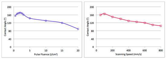 Figure 5 plots the resulting contact angles for various pulse fluences and scanning speeds, shown on the left and right, respectively. Only one variable was adjusted for each set of measurements. From Figure 5, it is evident that when the pulse fluence increased from 0.5 to 2 J/cm2, the contact angle increased with the pulse fluence and reached the maximum value at the fluence of 2 J/cm2. The further increase in the pulse fluence to 20 J/cm2 caused a reduction in the contact angle. This was because the ablation-dominated process where excess fluence was present removed too much material from the surface before re-solidification [31]. A similar trend can be observed for the scanning speed. The maximum contact angle was reached at the scanning speed of 100 mm/s. The further increase in the scanning speed caused the ablation to be less effective. These results indicate that a balance between material ablation and re-solidification is critical in creating the desired hydrophobic surface.