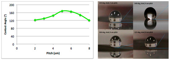 Current research on laser-based hydrophobic processes mainly uses femtosecond (fs) solid state lasers (e.g., Ti:sapphire). A group of scientists have applied this method to their research [20,21]. By utilizing the laser’s powerful pulses to produce microgrooves on the metal surface, they controlled the wetting properties of the metal and created a new surface that was highly absorptive, superhydrophobic, and self-cleaning. Another group manufactured hierarchical structures with an fs laser [22]. They divided the process into two steps: first, a microscale ablation was produced on stainless steel at a high pulse energy and with different velocities; second, nanostructures were ablated on top of the micro-structures using laser-induced periodic surface structures (250 nm high and with a period of 600 nm) to create a hierarchical structure.